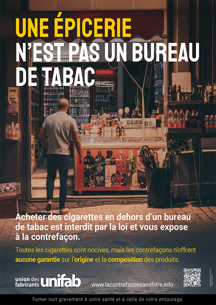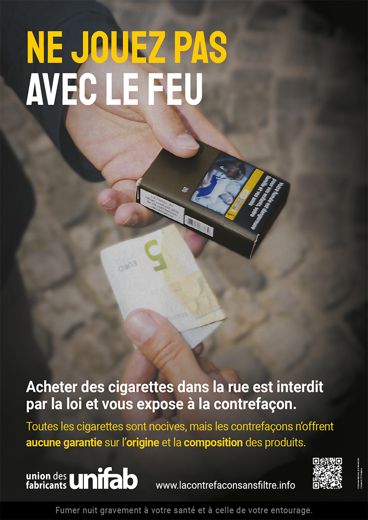 Depuis 2021, l’Unifab mène chaque année des campagnes de prévention pour sensibiliser le public aux dangers économiques, sanitaires et sécuritaires de la contrefaçon de cigarettes.